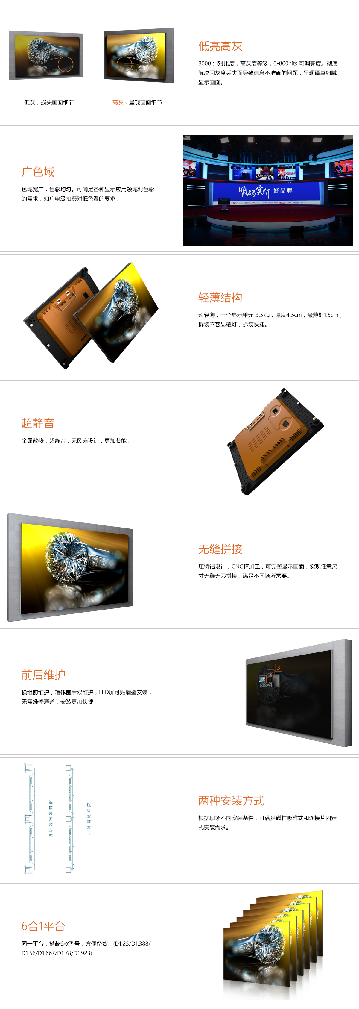 六:金屬散熱,超靜音無風扇設(shè)計,更加節(jié)能。 模組前維護,箱體前后雙維護,led屏可貼墻壁安裝,無需維修通道,安裝更加快捷